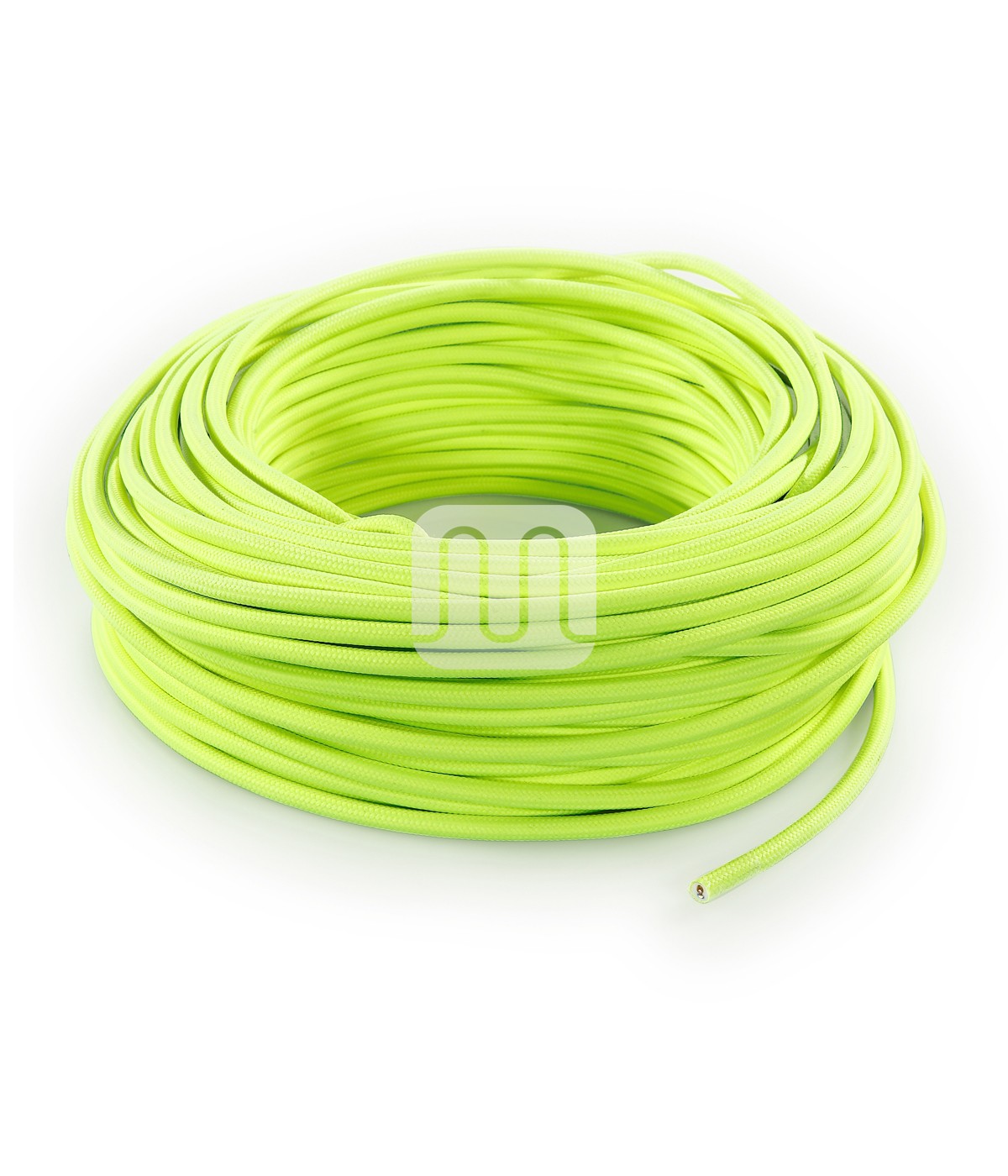Câble électrique flexible rond gainé de tissu coloré jaune fluo.
