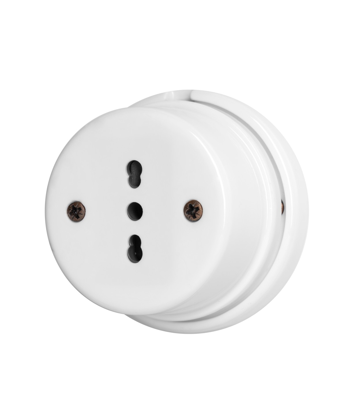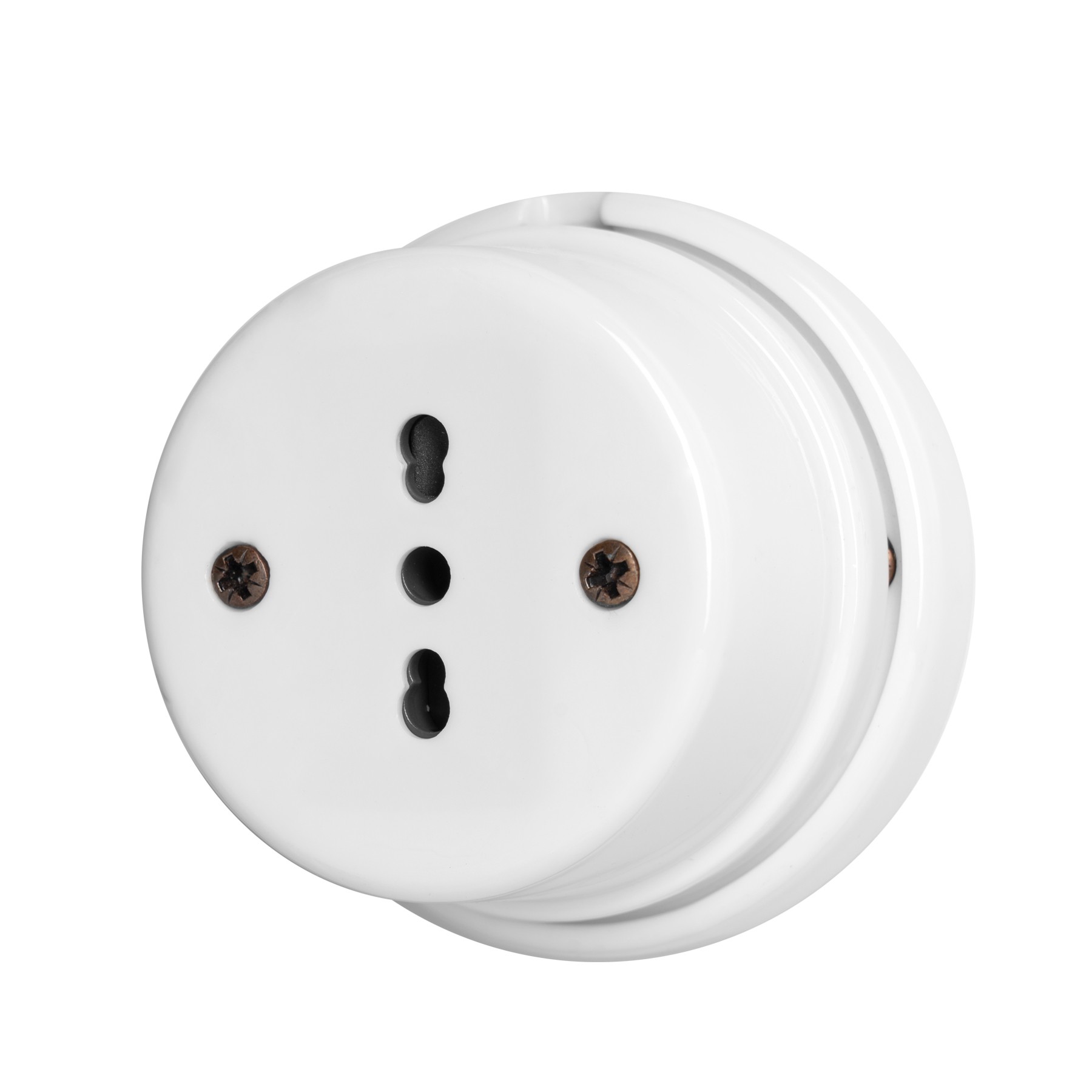 Prise 10/16A 2P+T bivalent en porcelaine blanche.