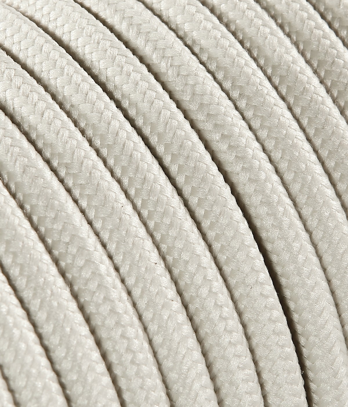 Câble électrique flexible rond gainé de tissu coloré crème.