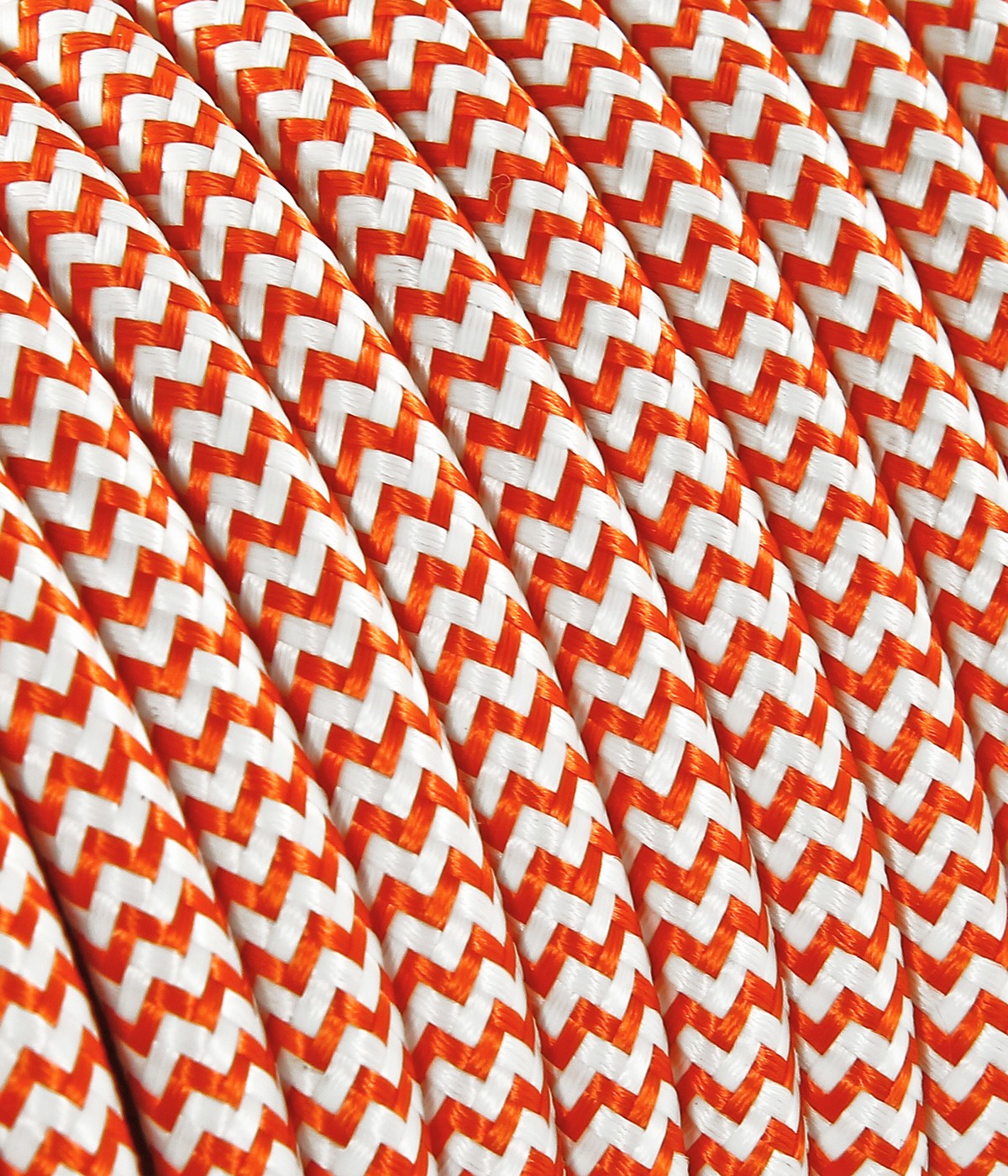 Câble électrique flexible rond gainé de tissu coloré zigzag blanc/orange.